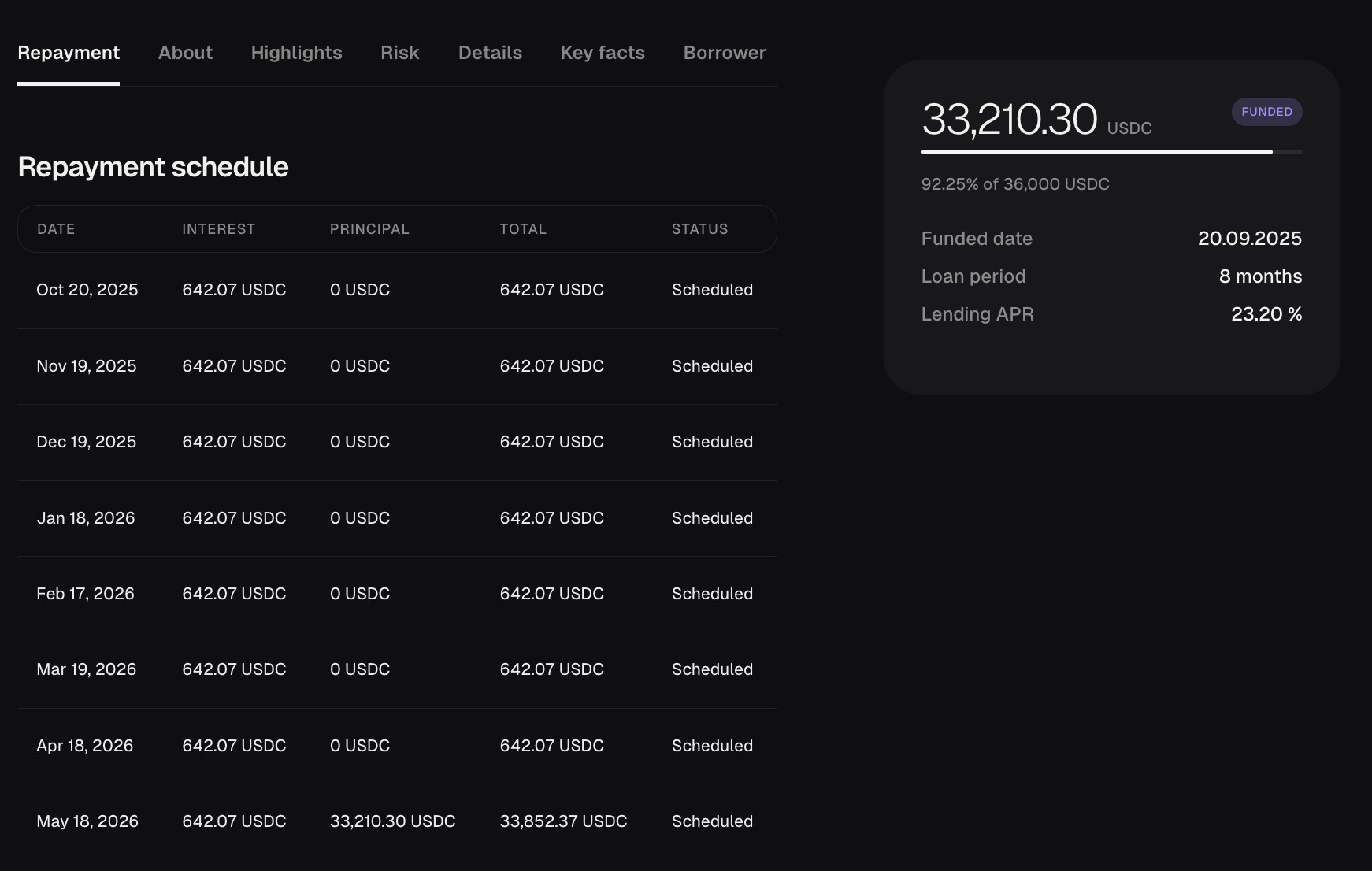 - Sobald eine Finanzierungsphase abgeschlossen ist, erscheint sie im Abschnitt Zahlungen. Am Ende der Laufzeit wird das gesamte Kreditkapital an die Investoren zurückgezahlt.